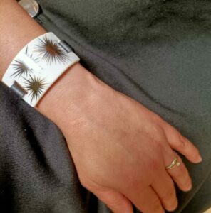Le bracelet est réalisé en cuir pleine fleur noir, tranches noires, finition maroquinière filetée. La fermeture est pratique, elle se fait par bouton de col argenté.